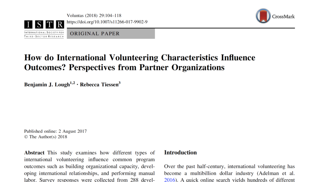Title: How do International Volunteering Characteristics Influence Outcomes? Perspectives from Partner Organizations Publisher: International Society for Third-Sector Research Type: Publication Theme: Outdoor and Experiential Learning – workcamps Short Description: This study examines how different types of international volunteering influence common program outcomes such as building organizational capacity, developing international relationships, and performing manual labor. Survey responses were collected from 288 …