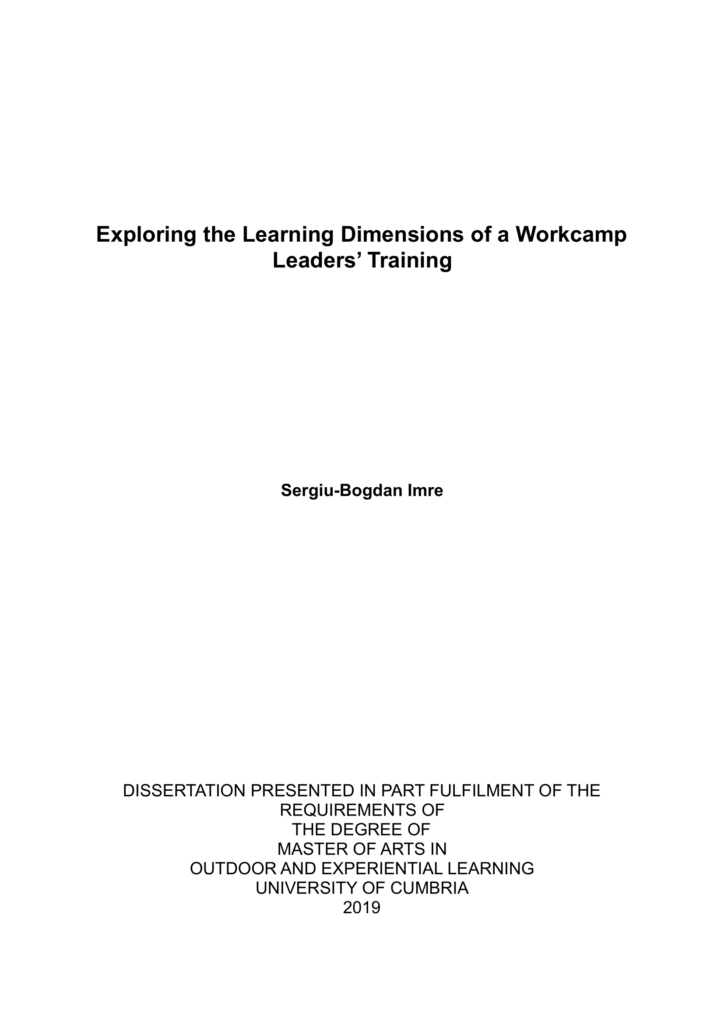 Title: Exploring the learning dimensions of a workcamp leaders’ training Publisher: University of Cumbria, UK Type: MA Dissertation Theme: Outdoor and Experiential Learning – workcamps Related project: IVS Research Short Description: While more research about the impact of workcamps has been carried out in recent years, studies about workcamp leaders and how they are trained is scarce. This piece is meant …